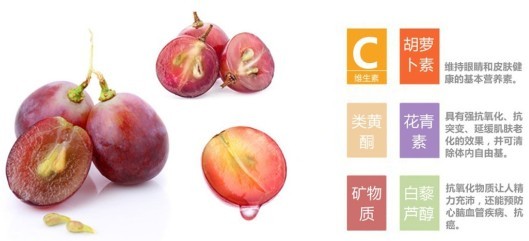 葡萄是温补阳气的食品,不仅具有养肝的效果,而且气血也会得以修复,达到养颜美容的效果。此外,大量的葡萄糖及果糖,易被人体吸收,迅速转化为热量,恢复体力,消除疲劳。果肉中含有特殊的氨基酸,有助提升脑机能。